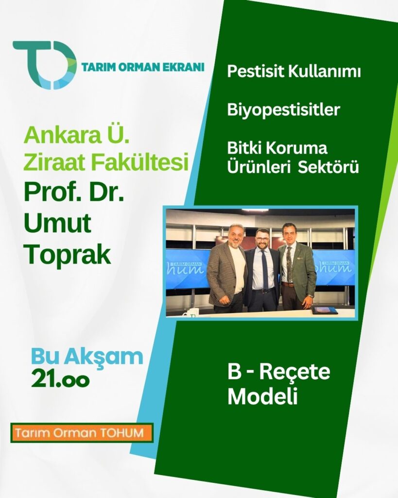 Sunuculuğunu ve yapımcılığını Galip Umut Özdil’in üstlendiği, yönetmenliğini ise Tarkan Biçer’in yaptığı programda, pestisit kullanımı, biyopestisitlerin yükselen önemi, bitki koruma ürünleri sektöründeki güncel dönüşüm süreçleri ve B-Reçete Modeli kapsamındaki yeni uygulamalar ele alındı. Prof. Dr. Toprak, biyopestisitlerin sürdürülebilir tarımsal üretim açısından stratejik bir konum kazandığını vurguladı. Ayrıca Türkiye’nin bu alandaki Ar-Ge kapasitesinin, biyoteknolojik inovasyonlarla birlikte uluslararası rekabet gücünü artırabileceğini belirtti.